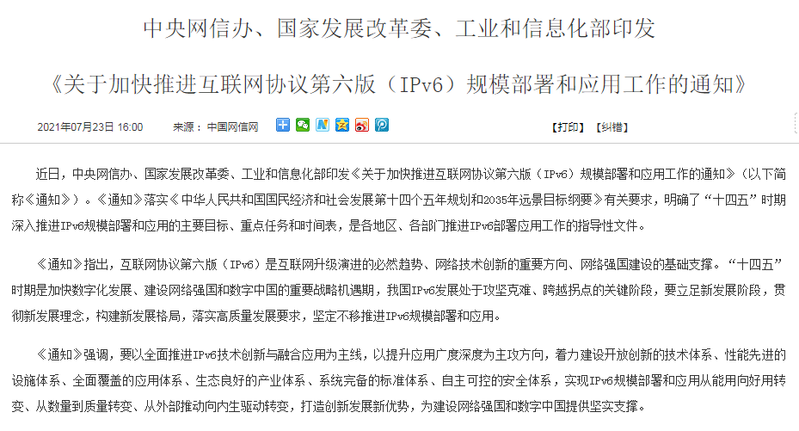 近日,中央網(wǎng)信辦、國家發(fā)展改革委、工業(yè)和信息化部印發(fā)《關(guān)于加快推進(jìn)互聯(lián)網(wǎng)協(xié)議第六版(IPv6)規(guī)模部署和應(yīng)用工作的通知》(以下簡稱《通知》)?!锻ㄖ仿鋵?shí)《中華人民共和國國民經(jīng)濟(jì)和社會(huì)發(fā)展第十四個(gè)五年規(guī)劃和2035年遠(yuǎn)景目標(biāo)綱要》有關(guān)要求,明確了“十四五”時(shí)期深入推進(jìn)IPv6規(guī)模部署和應(yīng)用的主要目標(biāo)、重點(diǎn)任務(wù)和時(shí)間表,是各地區(qū)、各部門推進(jìn)IPv6部署應(yīng)用工作的指導(dǎo)性文件?!锻ㄖ分赋觯ヂ?lián)網(wǎng)協(xié)議第...